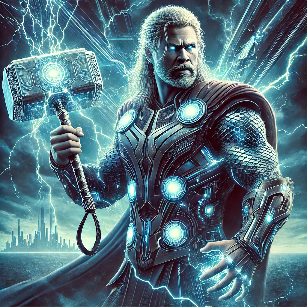 “A striking hybrid depiction of Thor, blending elements of Norse mythology and futuristic sci-fi aesthetics. Thor is portrayed as a mighty figure wielding a glowing, high-tech version of Mjolnir, with intricate engravings that emit energy. His armor combines traditional Viking designs with sleek, metallic exo-suit features, glowing with energy conduits. The background is a dramatic storm with thunderclouds, lightning bolts, and a futuristic cityscape visible on the horizon. The color palette emphasizes electric blues, metallic silvers, and stormy grays. Thor’s expression is fierce and determined, exuding both power and wisdom.”