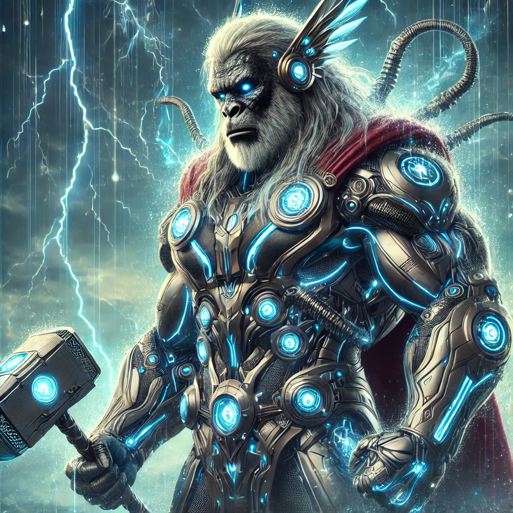 “A powerful superhero avatar, blending the mythological essence of Thor with the primal strength and futuristic enhancements of a cybernetic gorilla. The character has the muscular physique and primal features of a gorilla, with glowing cybernetic implants and mechanical limbs that amplify strength. They wield a high-tech version of Mjolnir, engraved with glowing runes and energy conduits. The armor combines sleek, metallic Viking-inspired designs with a rugged, futuristic exosuit, featuring neon-blue energy highlights. Their face merges the intelligence and determination of Thor with the fierce, primal features of the gorilla, exuding both wisdom and raw power. The background is a stormy, futuristic jungle, with lightning bolts illuminating the high-tech landscape. The color palette emphasizes electric blues, metallic silvers, and stormy grays, with glowing accents symbolizing transformation and heroic energy.”